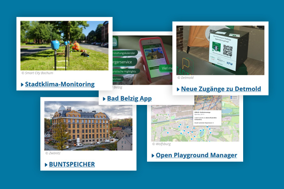 Aktuell umfasst das Portfolio neun Smart City Lösungen mit ganz unterschiedlichen Ansätzen von der City-App, über den Grüne-Welle-Assistenten für Radfahrende bis zur Software für Feuerwehren. Ein Kriterium erfüllen jedoch alle Lösungen gemeinsam: Sie zeichnen sich durch ihre grundsätzliche Übertragbarkeit aus - wie an diesen drei Beispielen aus Bochum, Wolfsburg und Zwönitz deutlich wird: